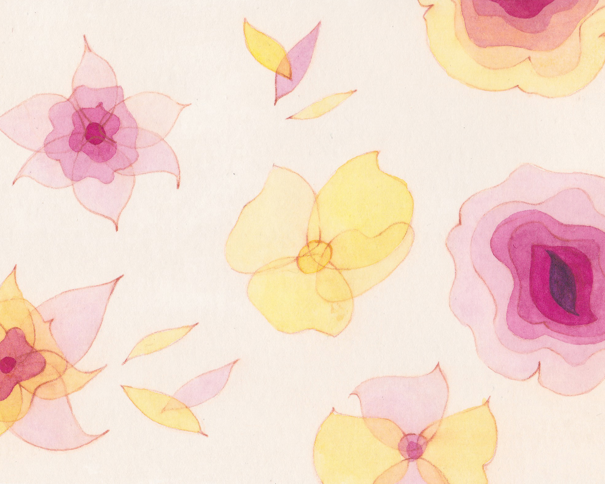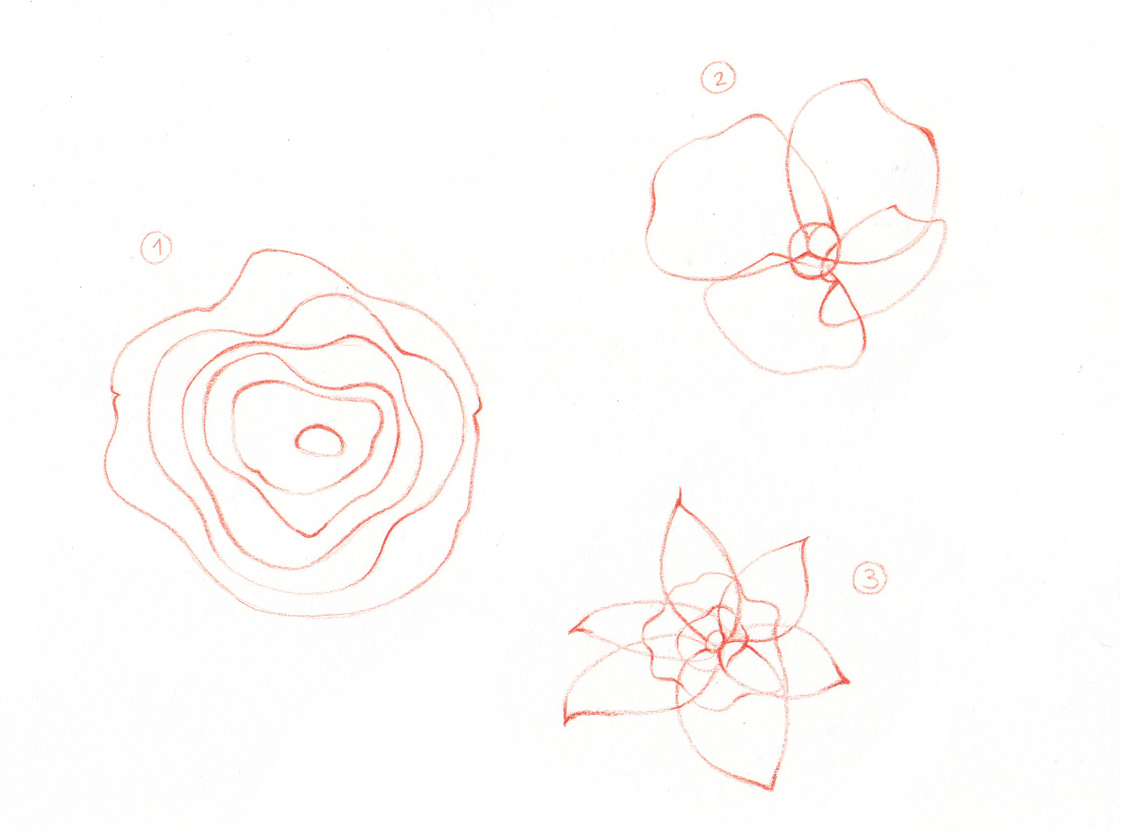 Realizzeremo dei fiori, semplificandone la forma e ed esagerando attraverso il disegno le sovrapposizioni fra i petali e le varie parti del fiore. Sfrutteremo poi queste sovrapposizioni per lavorare con le velature.