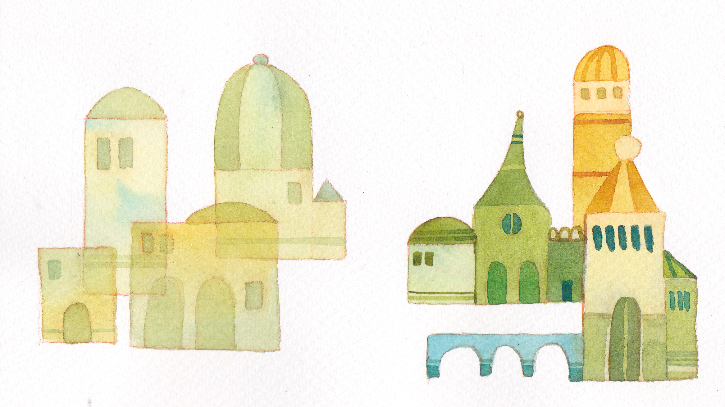 Nel riquadro qui sotto ad esempio puoi vedere come uno stesso soggetto possa essere trattato con un diverso uso delle velature: l’immagine di sinistra ha pochi strati, molto leggeri, che esaltano la trasparenza, mentre quella di destra crea contrasti più netti, utilizzando più strati di colore, anche denso, e mettendo in luce tutti i gradi di opacità che l’acquerello permette di ottenere.
