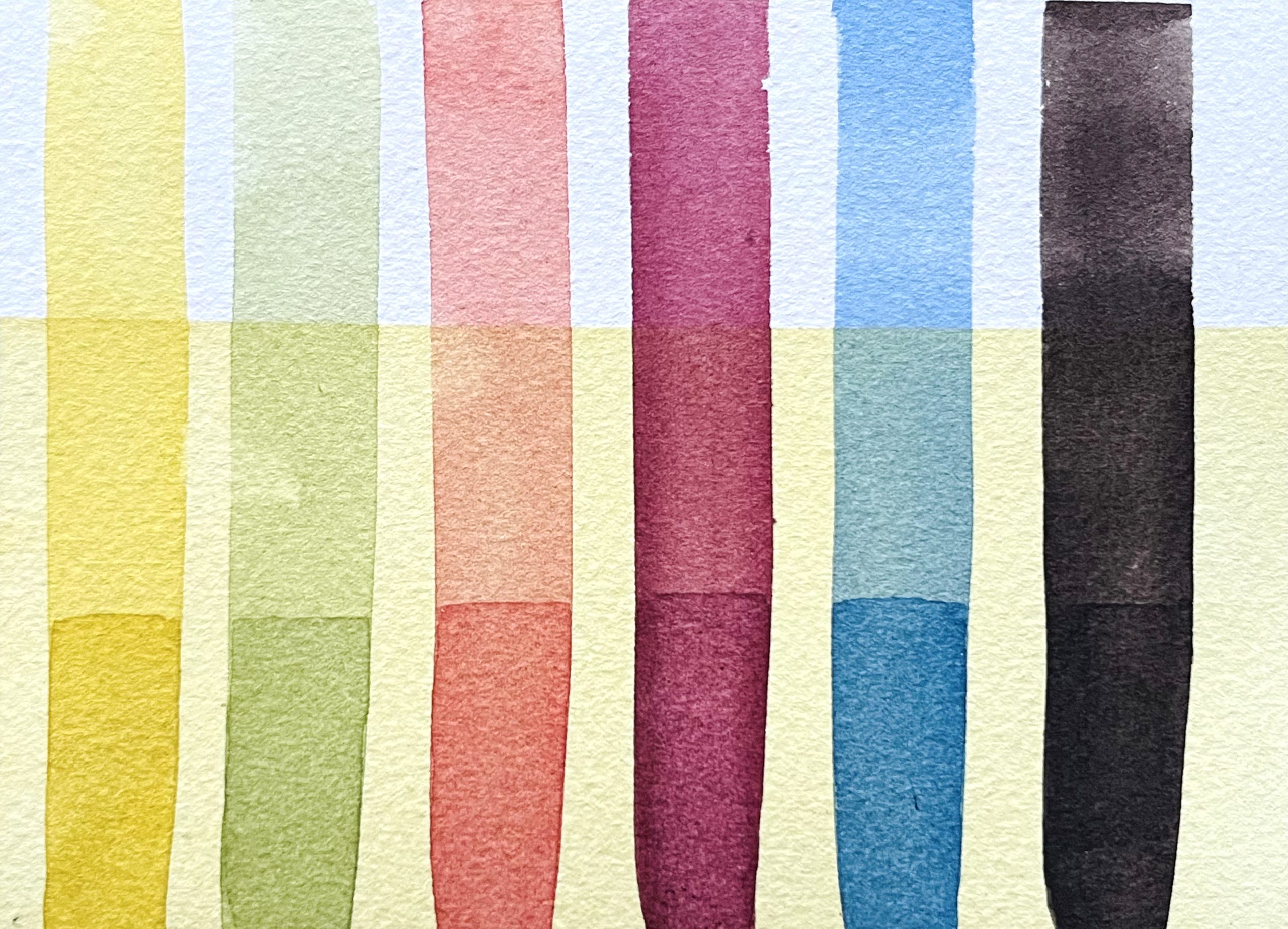 Per testare questo utilizzo della velatura, puoi stendere uno strato di un colore molto diluito (ad esempio il giallo) su una parte di foglio bianco, lasciarla asciugare, e poi fare delle righe di vari colori che intersechino sia lo sfondo giallo, sia la parte rimasta bianca, come vedi nell’immagine qui sotto. Questo ti mostrerà che effetto ha il colore sottostante sui colori: come vedi, qui ha l’effetto di “scaldarli” un po’ e farli virare tutti verso il giallo.