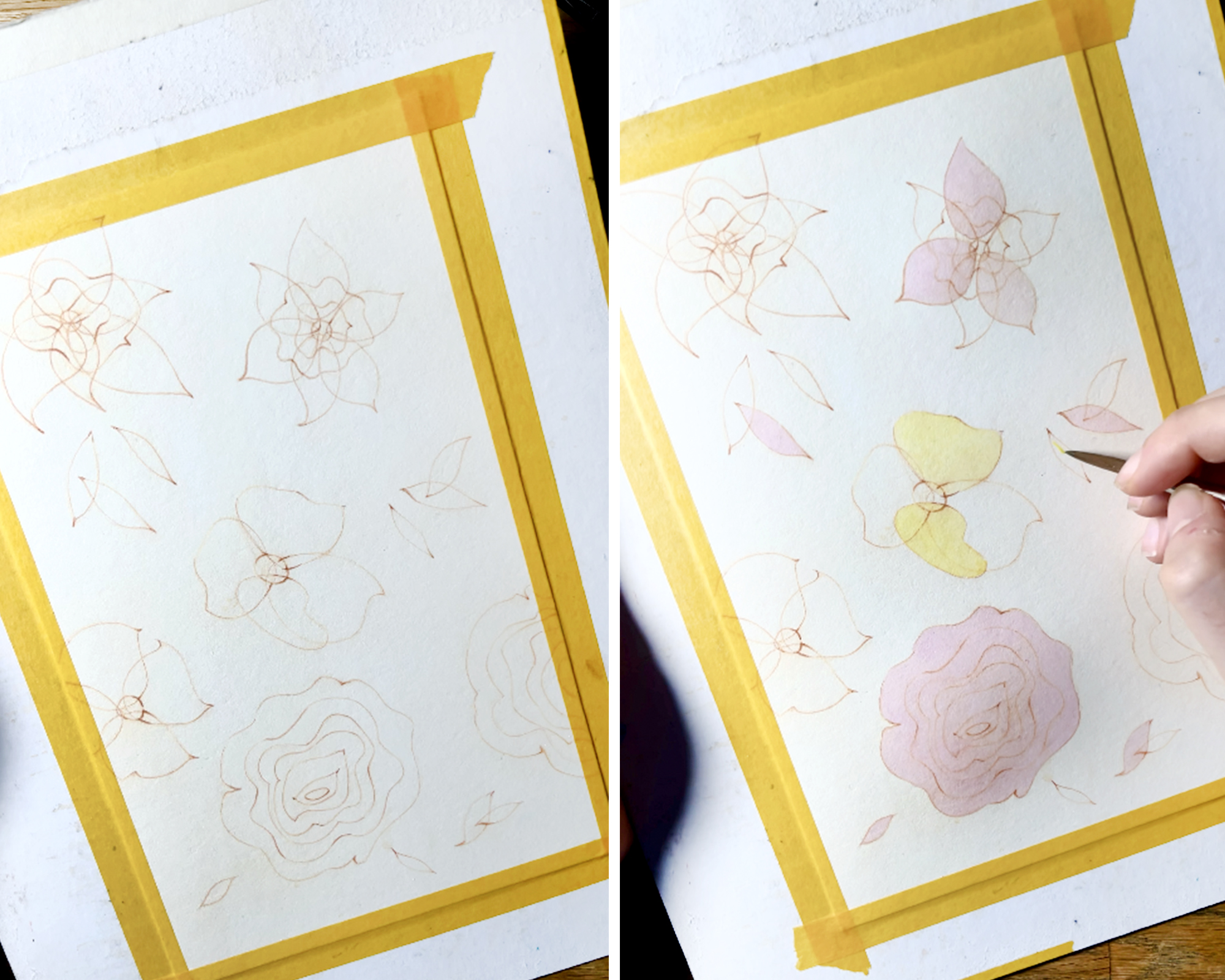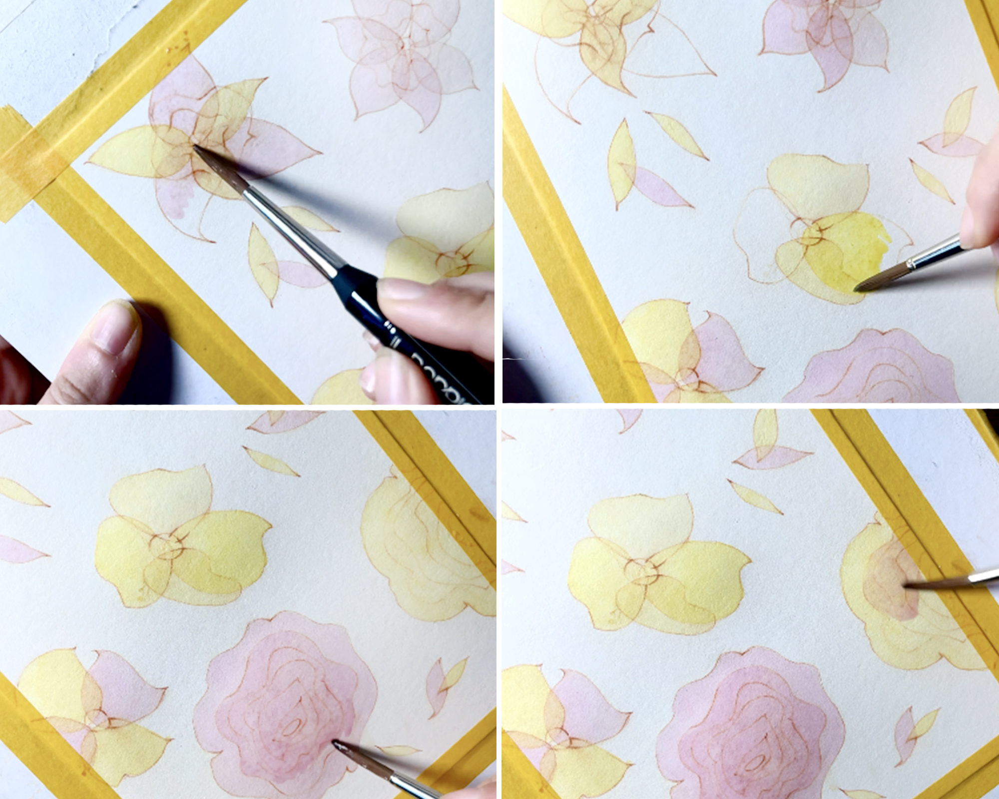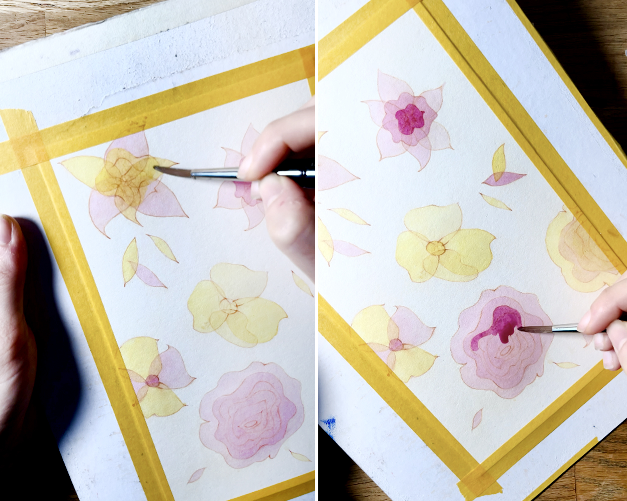 Decidi come stratificherai ogni fiore prima di iniziare in modo da sapere quale colore applicare come base. Lavorando con le velature, questo tipo di intenzionalità ti aiuta a procedere con ordine e a non trovarti con colori troppo scuri che non potrai più schiarire.